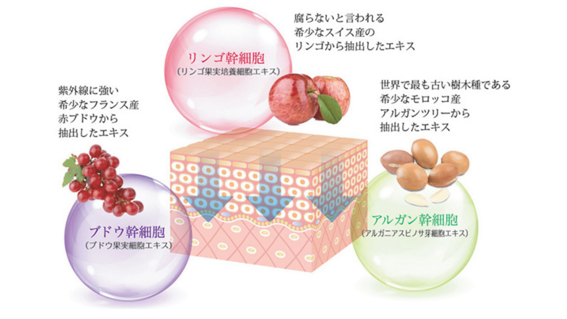 ホームケア・サロンケアの全ての製品に3つの希少な植物幹細胞が配合されております。REVIは、人間にはない植物特有の保水持続力と再生力に着目、その成分を採用し、お肌をみずみずしく元気にします。リンゴ・ブドウ・アルガン幹細胞の強い生命力で、お肌を様々なストレスからお守り、正常で美しい肌がつくられるのをサポートします。